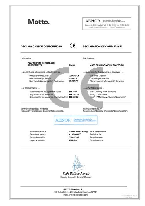 Specifications for Motto Elevation Mast Climbing Work Platforms MM50: